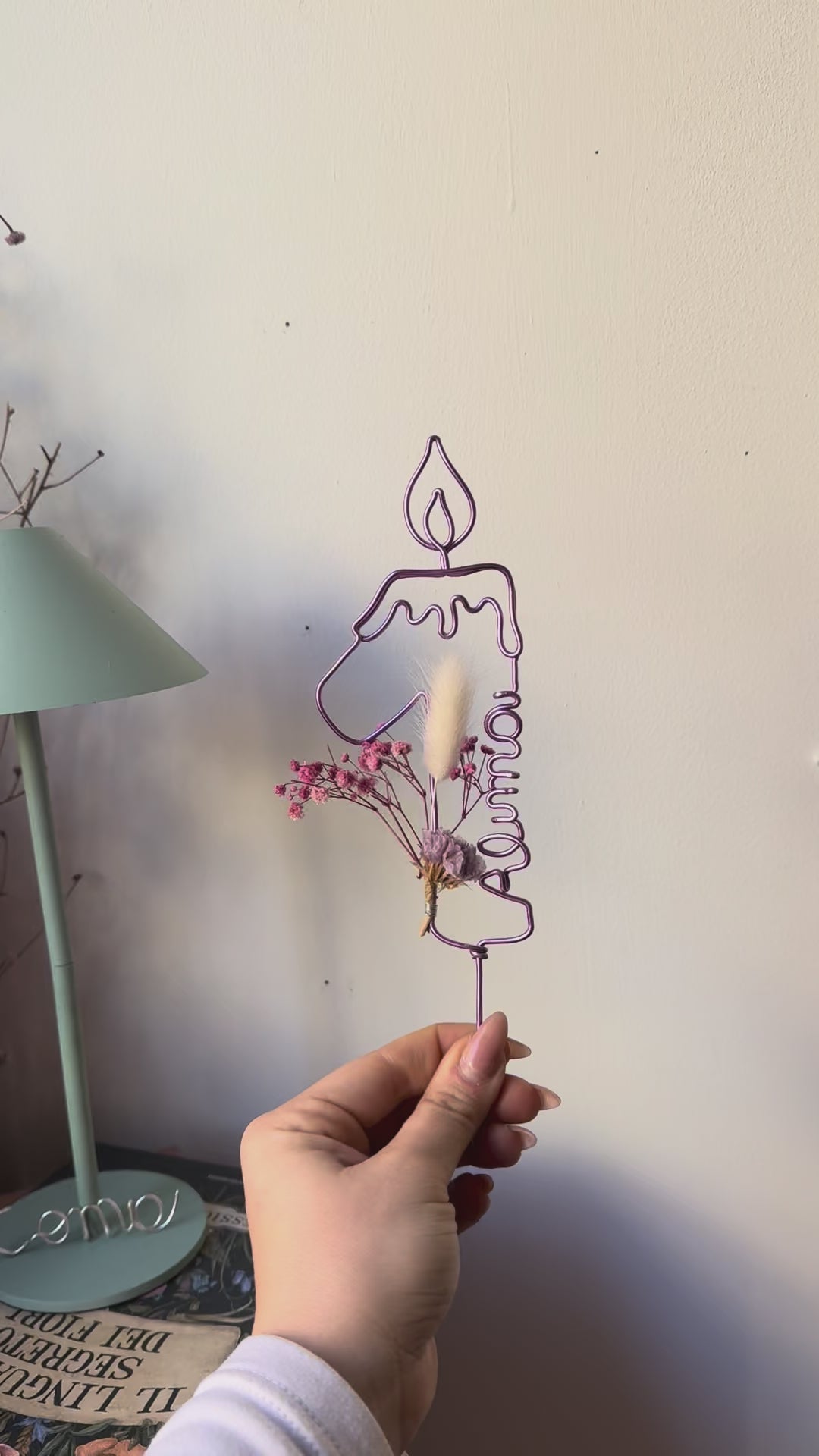Illustrazione da parete in metallo anodizzato con aggiunta di fiori naturali essiccati e colorati.